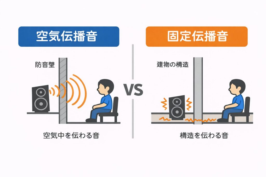 戸建住宅など独立した建物であれば、後者の固定伝播音は一度地面を介するため比較的影響が少ないですが、マンションなどの集合住宅では物理的に振動が伝わり音が漏れているケースなどがあるため、特に注意が必要です。