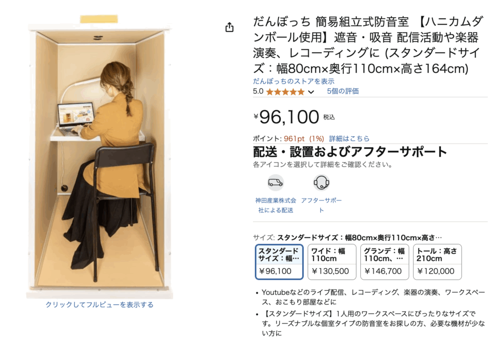 コスパよく防音室を導入したい方や、将来的に引越しや売却の可能性がある方にオススメです。