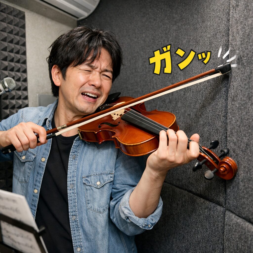 バイオリンは、小さい防音室だと弓が壁に当たってしまいます。少なくとも1.5畳以上の防音室を導入されるのがおすすめです。