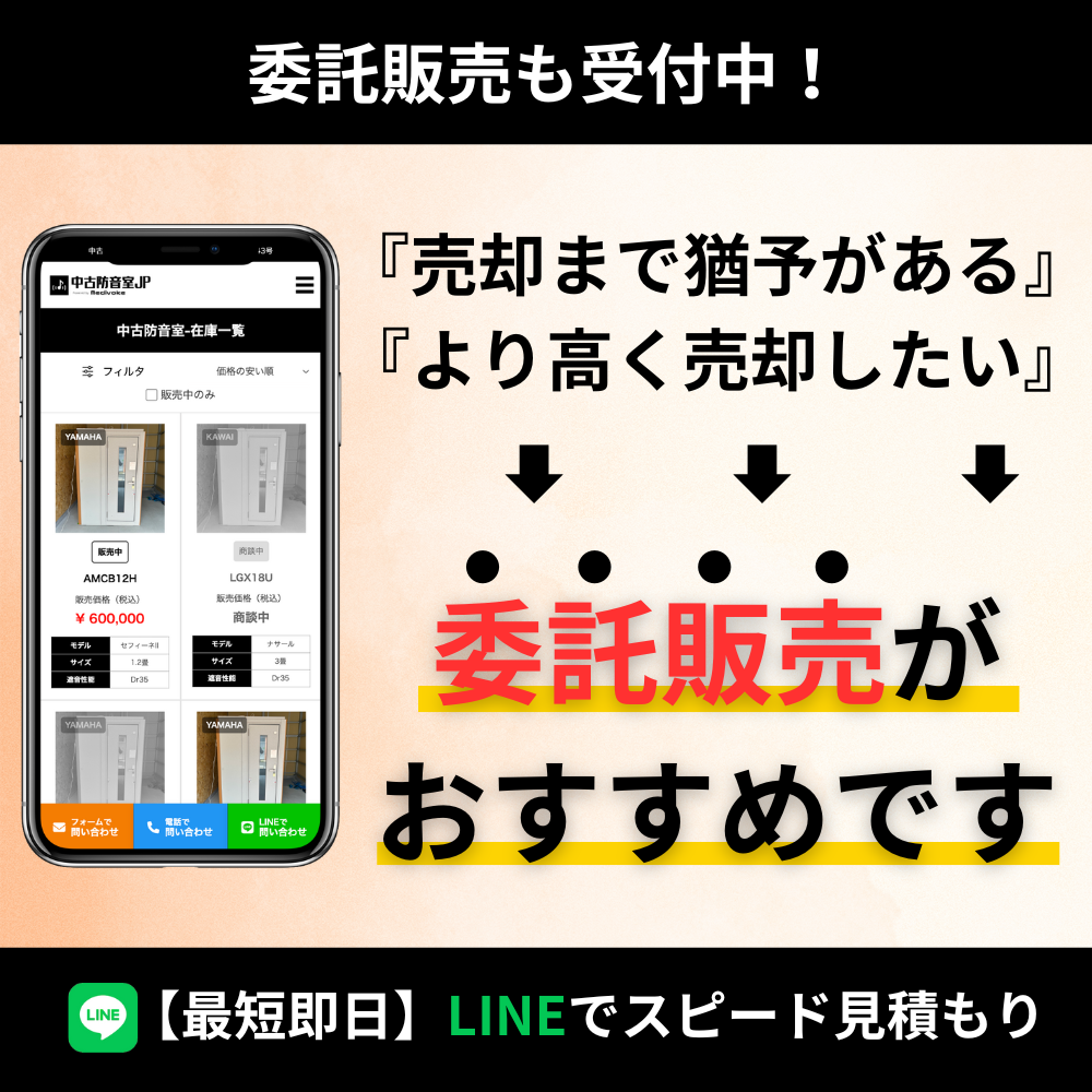 防音室は決して安価な買い物ではないと思います。そんな中、弊社では満足度はもちろん、経済的な観点でも最適な選択をご提案させていただいております。自動車の世界でも中古車が多くの方に選ばれるように、防音室においても中古で購入されることには大きなメリットがあります。リセールやコストパフォーマンスの面から、中古という選択肢は決して妥協ではありません。